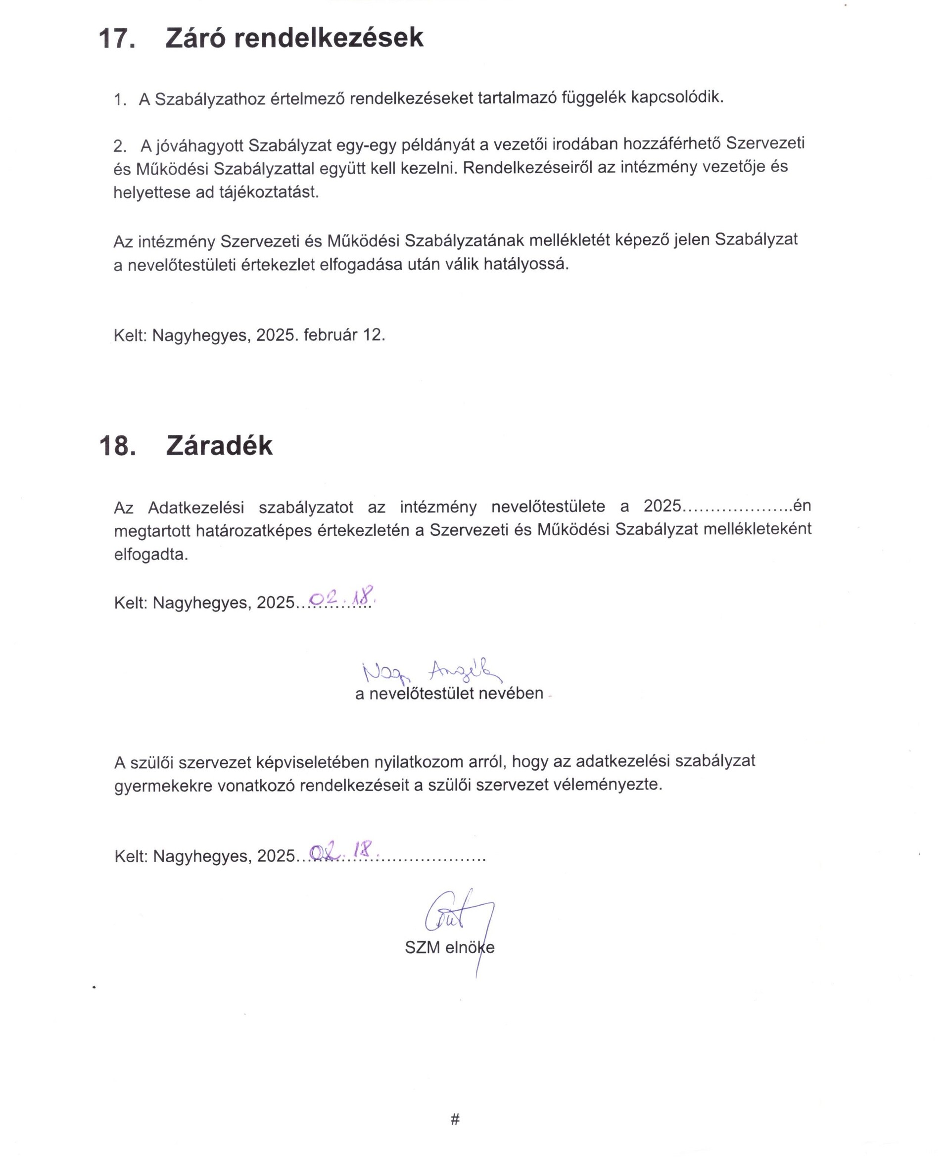 Az intézmény Szervezeti és Működési Szabályzatának mellékletét képező jelen Szabályzat a nevelőtestületi értekezlet elfogadása után válik hatályossá.