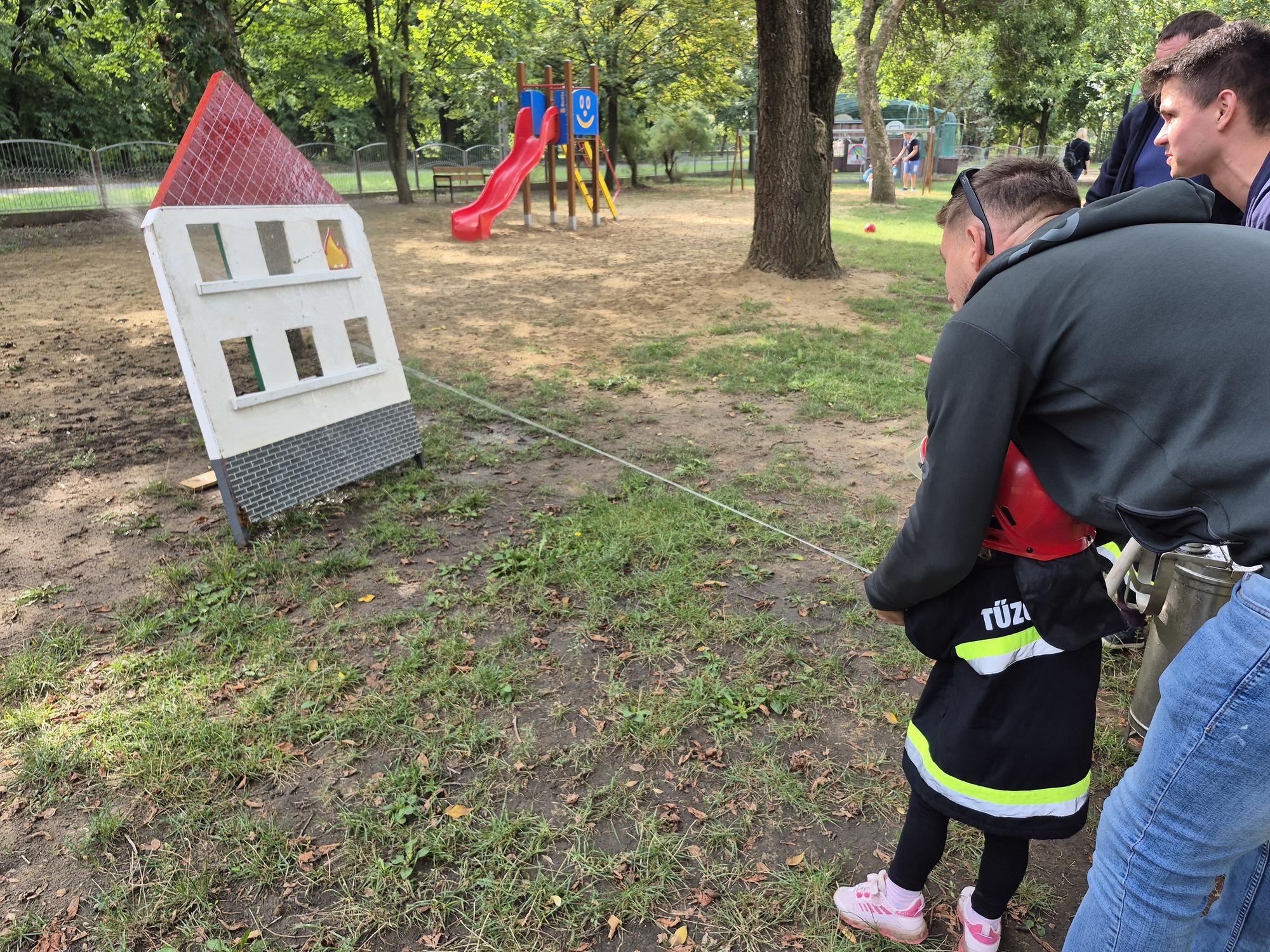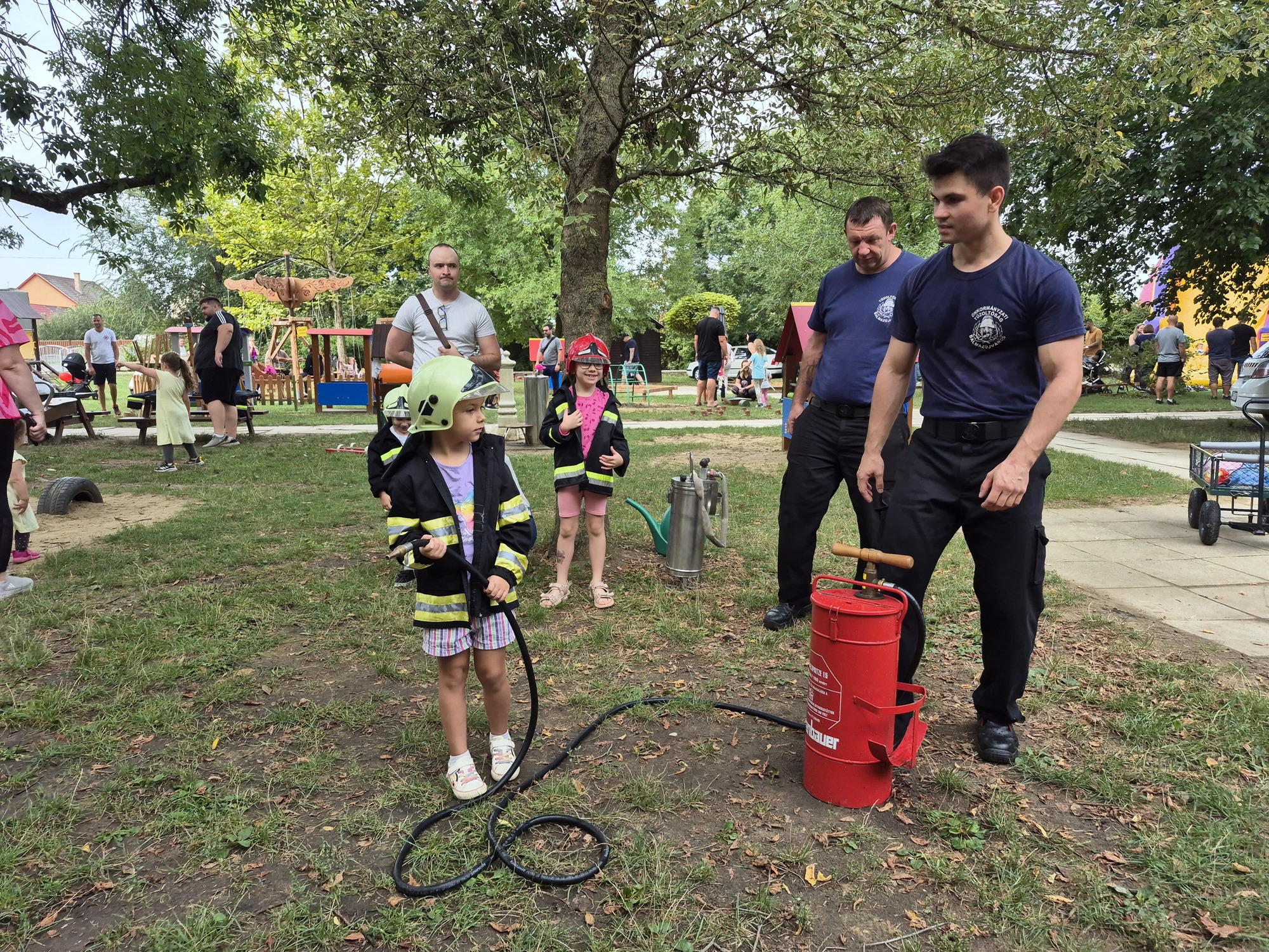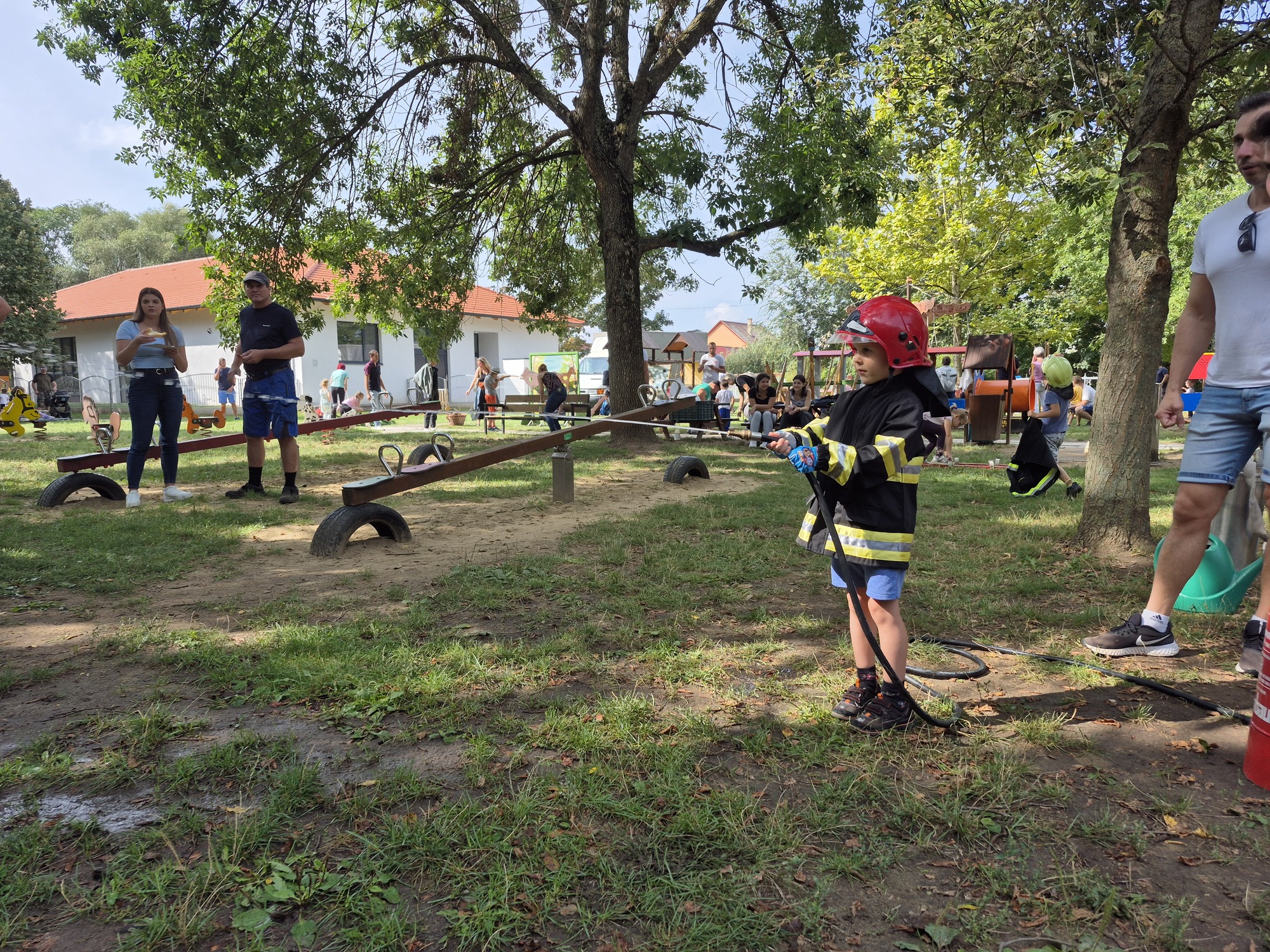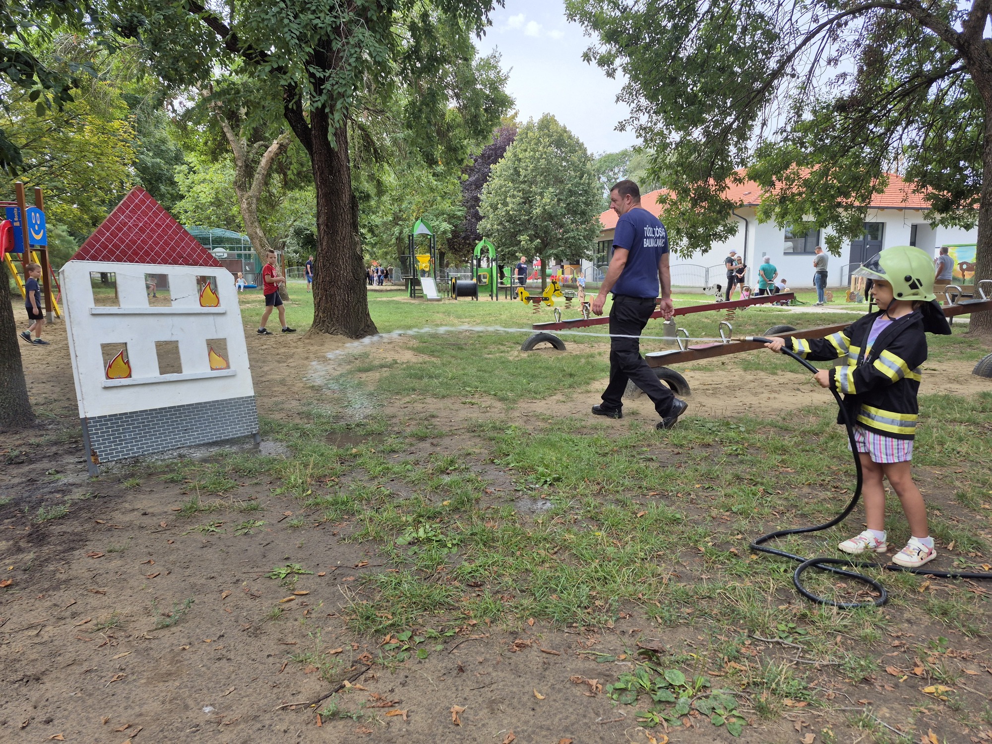 Ha már tűzoltás, akkor meg kell említeni a következő remek ötletet. A kis "tűzoltó" palánták beöltözve kabátba és sisakba ragadták meg a tömlőt és olthatták el a virtuális tüzet. Az intézményi dolgozók pedig szorgalmasan sütötték a lángost és a palacsintát, ezzel segítve az energia pótlását.