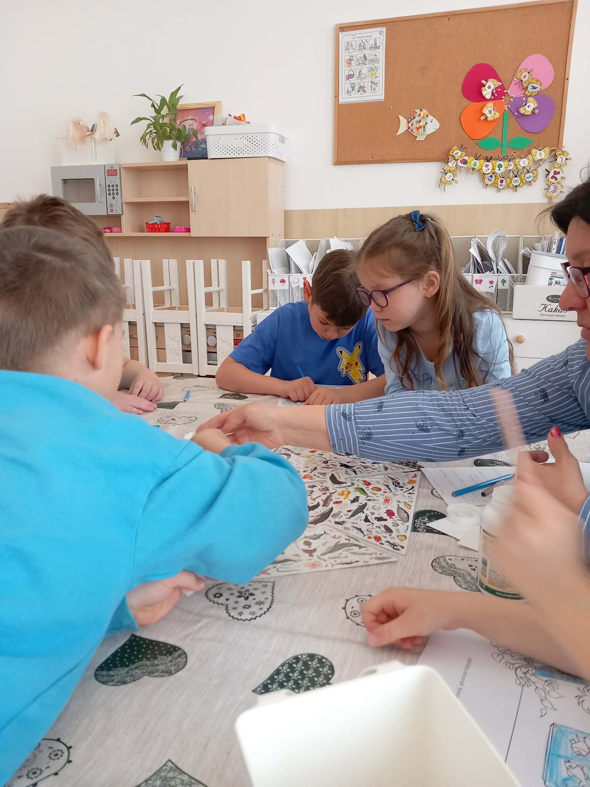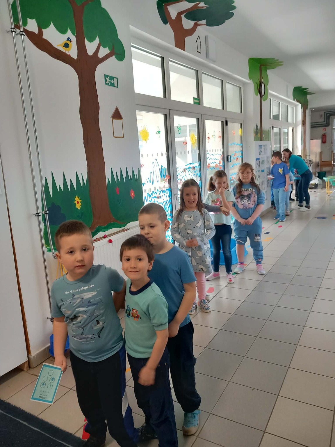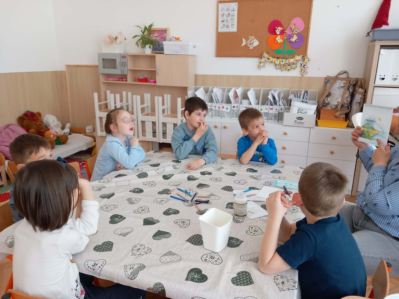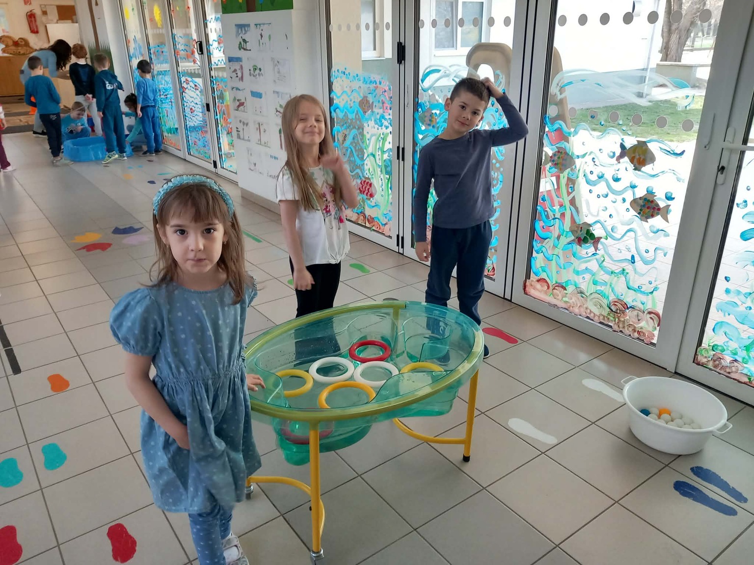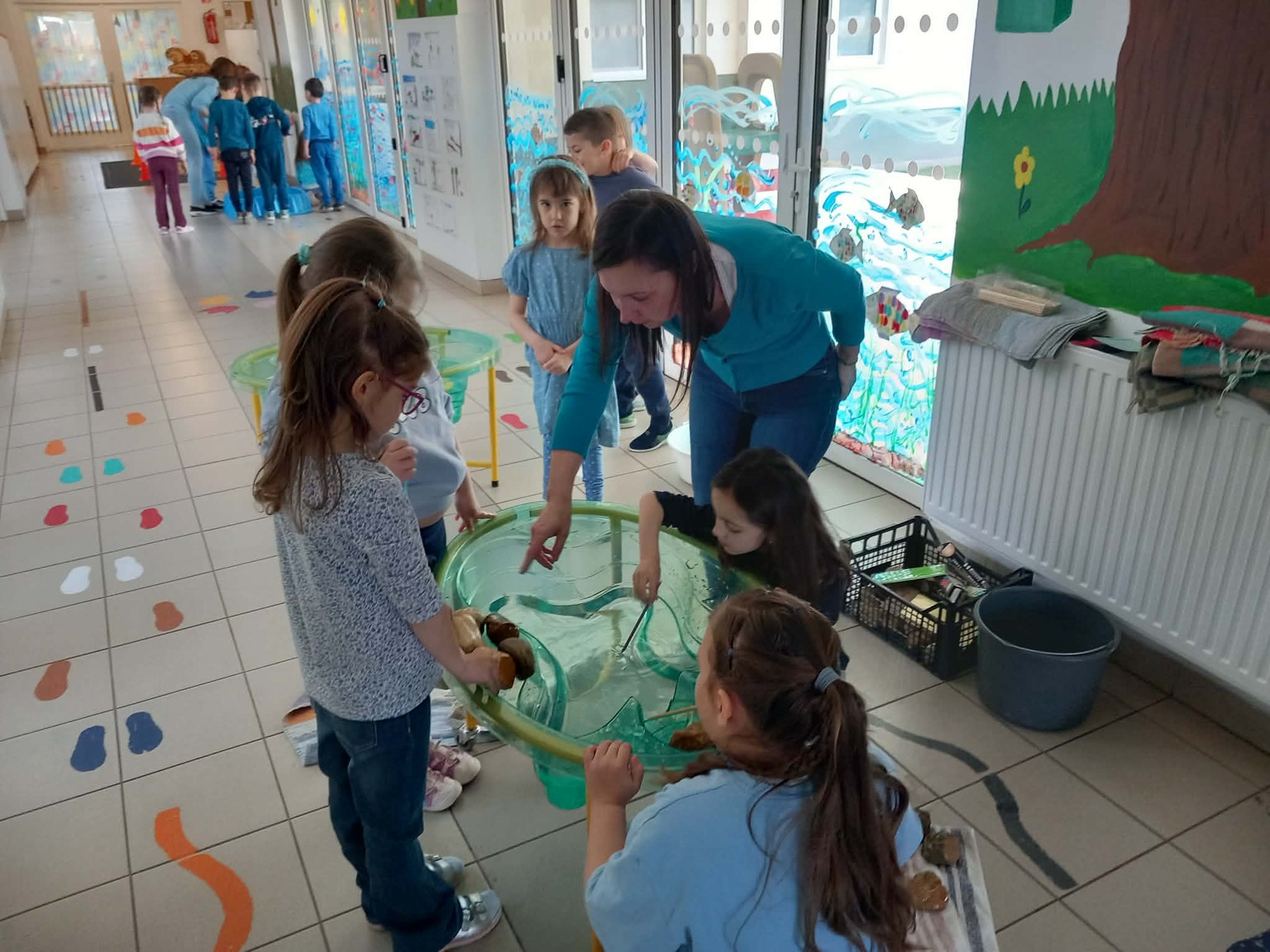A kisebb gyermekek a csoportszobában festettek, rajzoltak. A sok kis „vízcsepp” (kék ruhás gyermek) látványa, a játék hevétől kipirult arcocskák, a picik ámuló tekintete megerősítették meggyőződésünket: a természet szeretetére, megbecsülésére nevelést már kisgyermekkorban el kell kezdeni, hogy gyermekeink környezettudatosan gondolkodó felnőtté válhassanak.