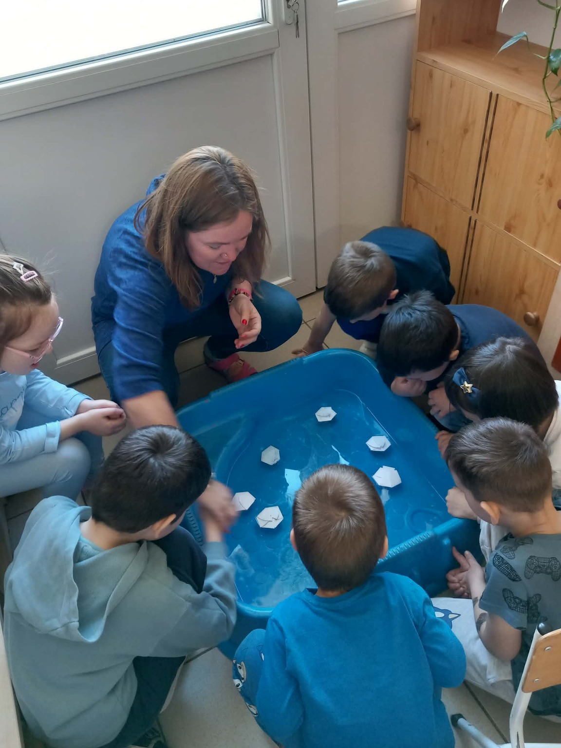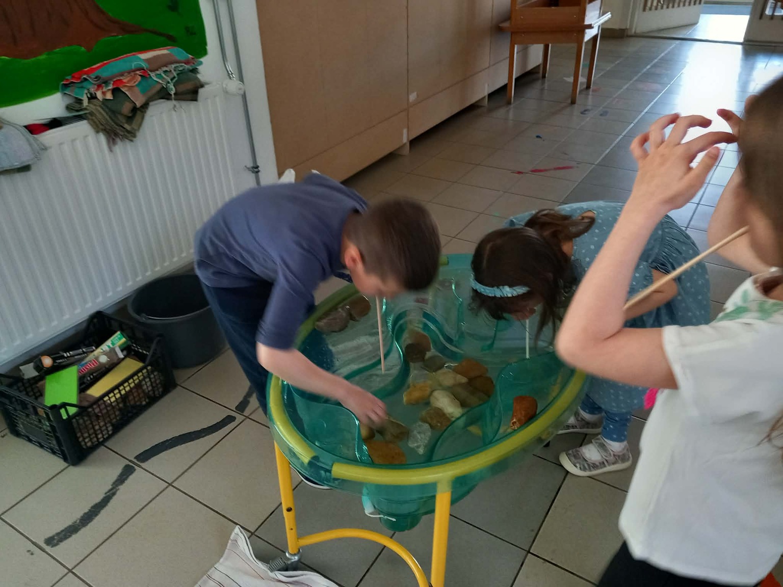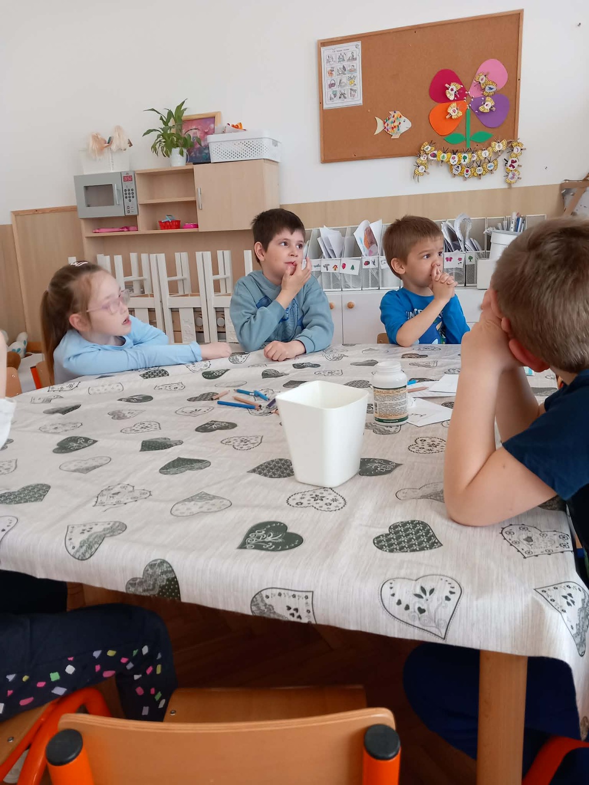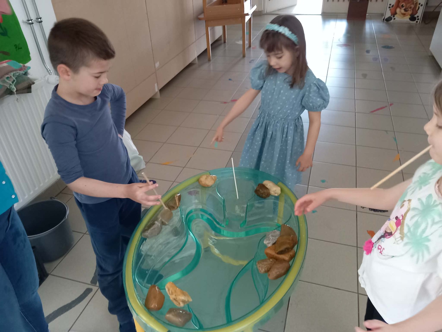 A kisebb gyermekek a csoportszobában festettek, rajzoltak. A sok kis „vízcsepp” (kék ruhás gyermek) látványa, a játék hevétől kipirult arcocskák, a picik ámuló tekintete megerősítették meggyőződésünket: a természet szeretetére, megbecsülésére nevelést már kisgyermekkorban el kell kezdeni, hogy gyermekeink környezettudatosan gondolkodó felnőtté válhassanak.
